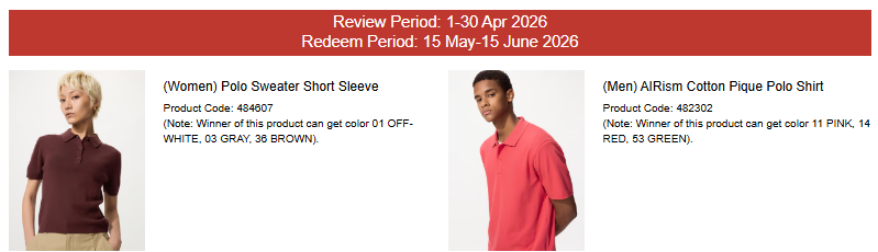A. Ulasan yang dikirim dari tanggal 1 – 30 April 2026, maka berpeluang mendapatkan GRATIS produk(484607) Polo Sweater Short Sleeve (hanya warna 03 Gray, 36 Brown, 01 Off White) ; atau (475367) AIRism Cotton Piqué Polo Shirt (hanya warna 11 Pink, 14 Red, 53 Green) (pilih salah satu). 100 pemenang akan diumumkan pada tanggal 15 Mei 2026.