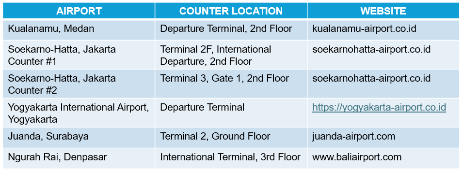 A: VAT Refund counters are located at selected Indonesian international airports as below :